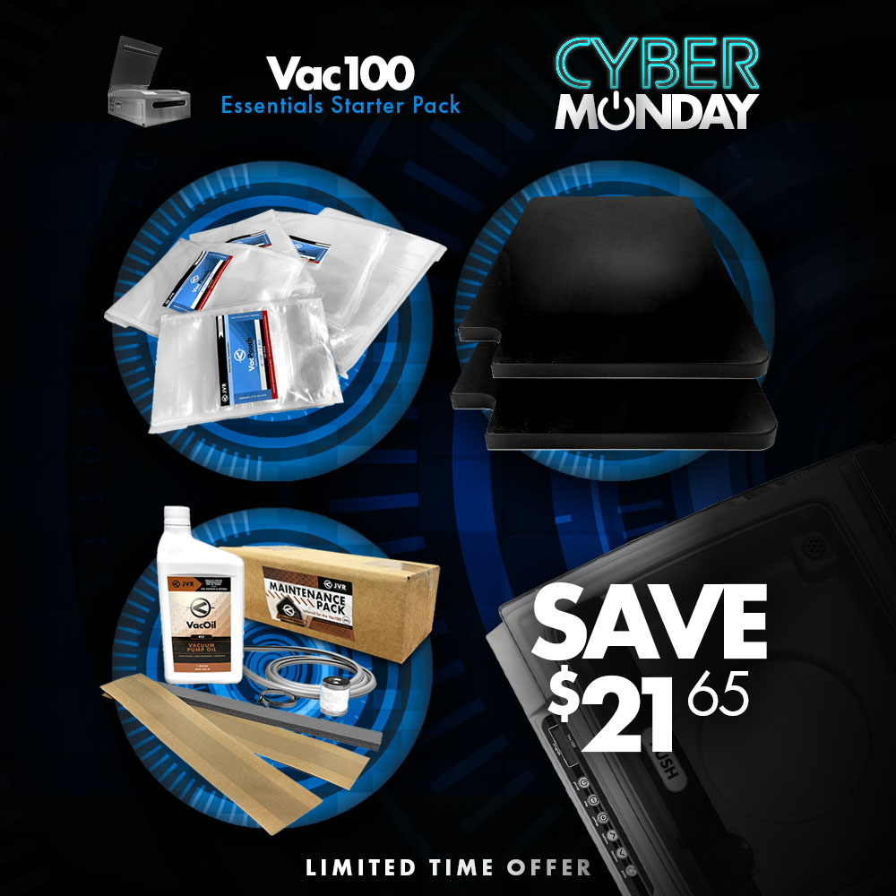 JVR Vac100 – Chamber Vacuum Sealer, 8×12 (4 mil) – 100 Pack – VacPouch, VacOil – Quart, JVR Industries RTIC Tumbler, Vac100 Cover, and 1L VacLok Canister.