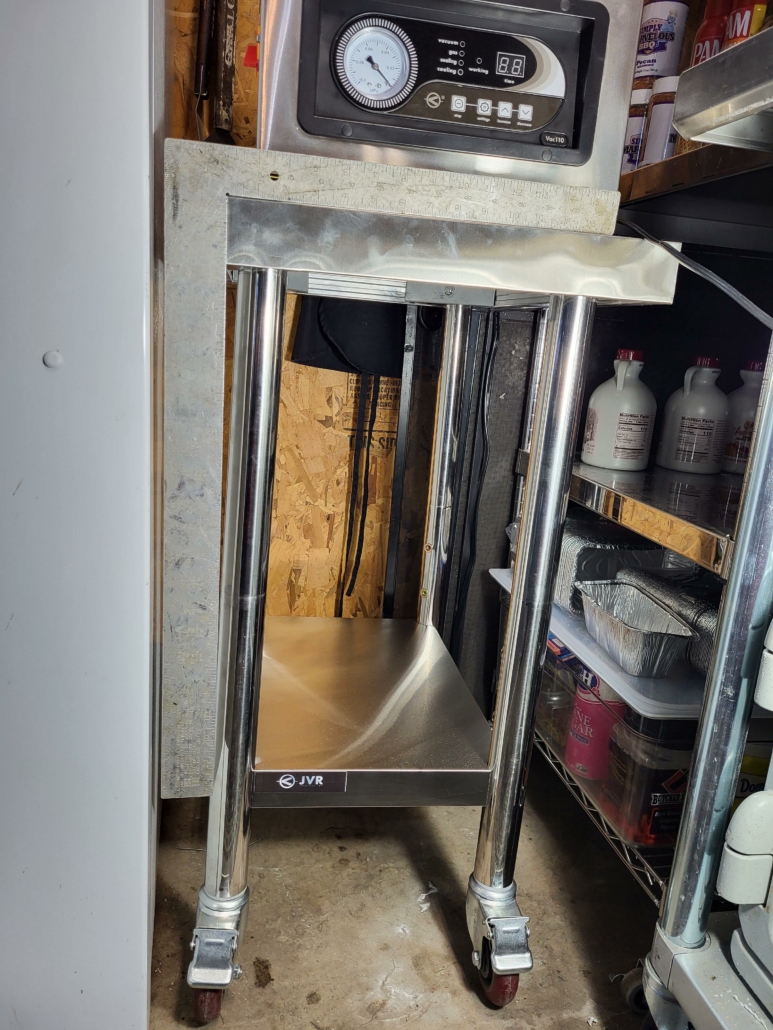 The stainless steel table provides a spacious storage surface. The top shelf is perfect for your chamber vacuum sealer. There is also a lower shelf for additional storage space for things like VacPouch, filler boards, VacOil, and more!